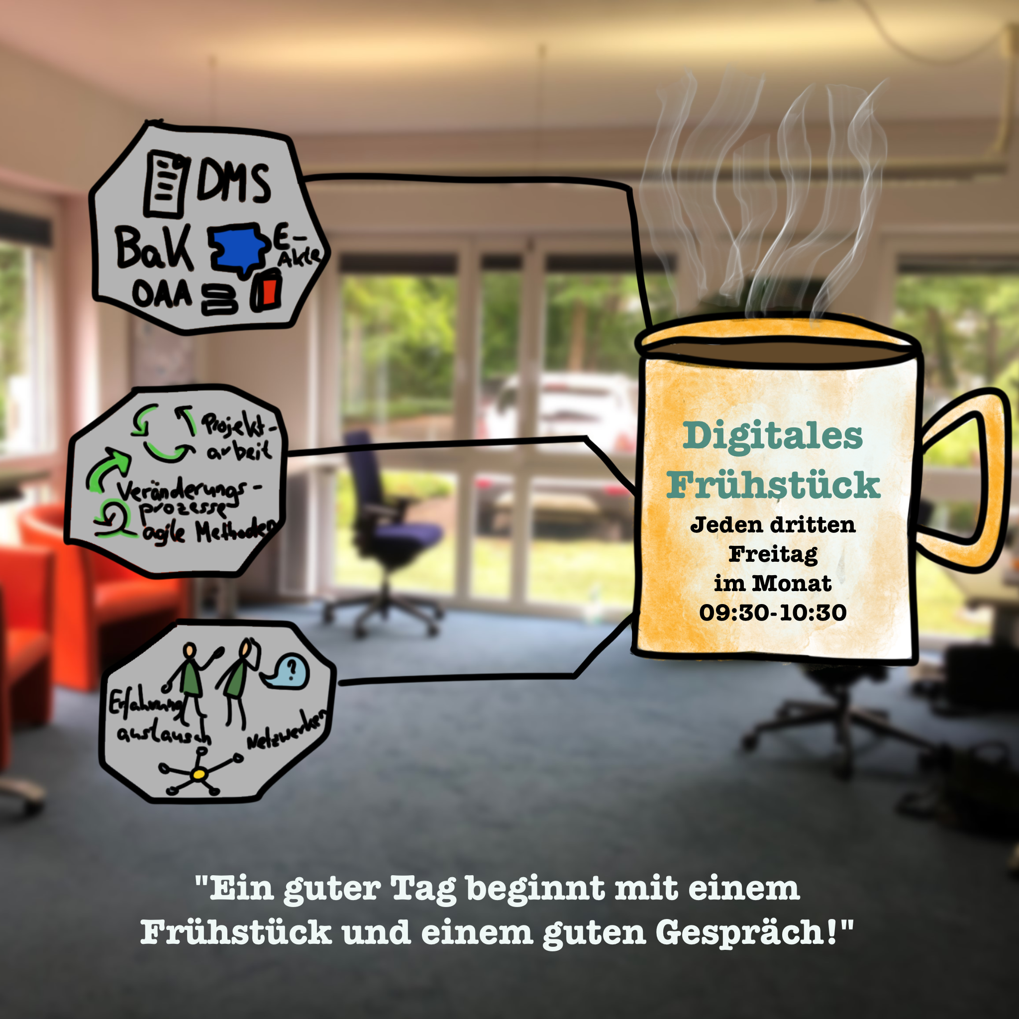 Jeden 3. Freitag im Monat treffen wir uns zum Digitalen Frühstück. Neben einem interessanten Input bleibt jede Menge Zeit zum Austausch. Alles zum nächsten Termin und die Daten für den Zugang finden Sie hier.